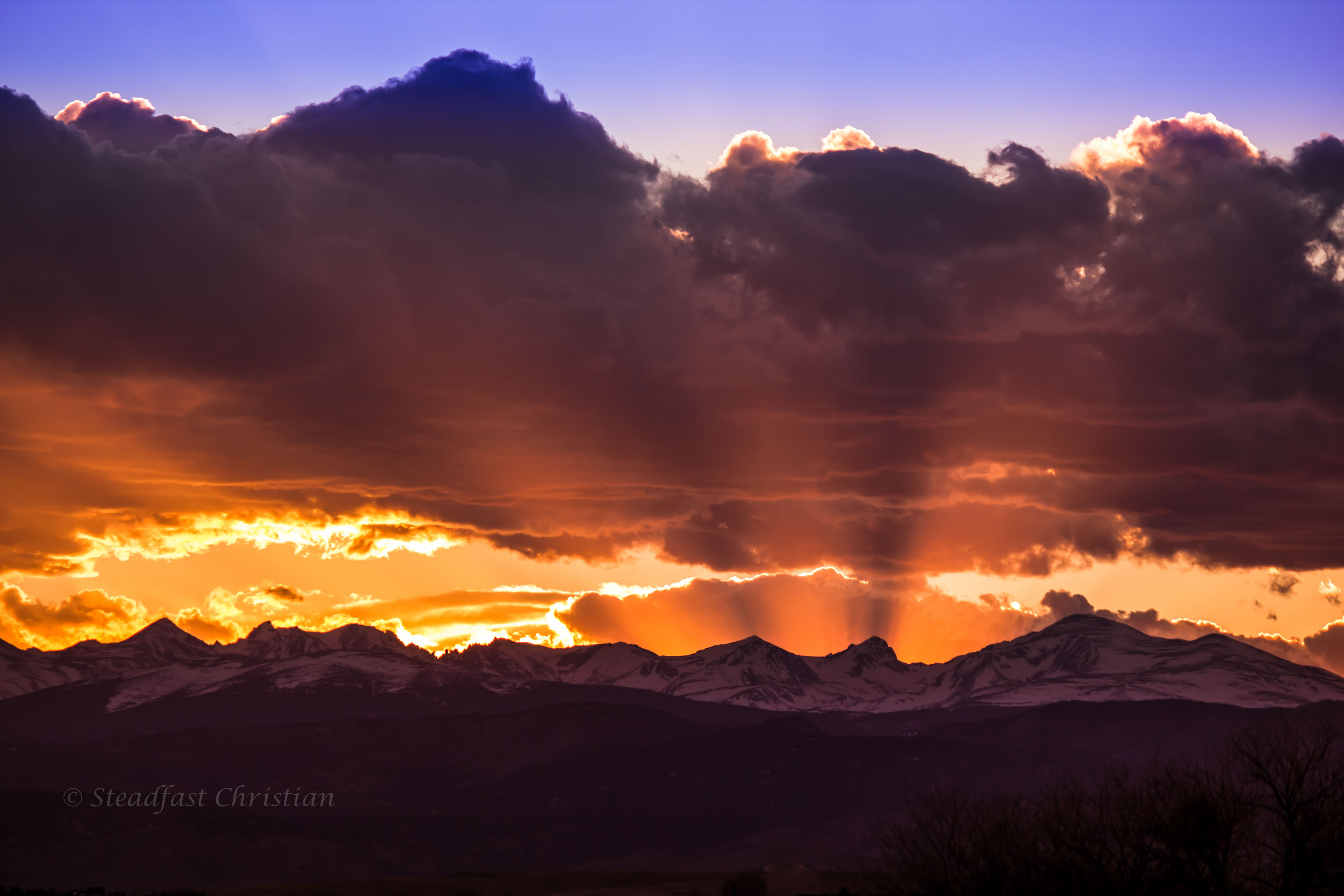 Three gorgeous sun rays burst forth from behind the Colorado Front Range Mountains just South of Long's Peak. It was an incredible sight!